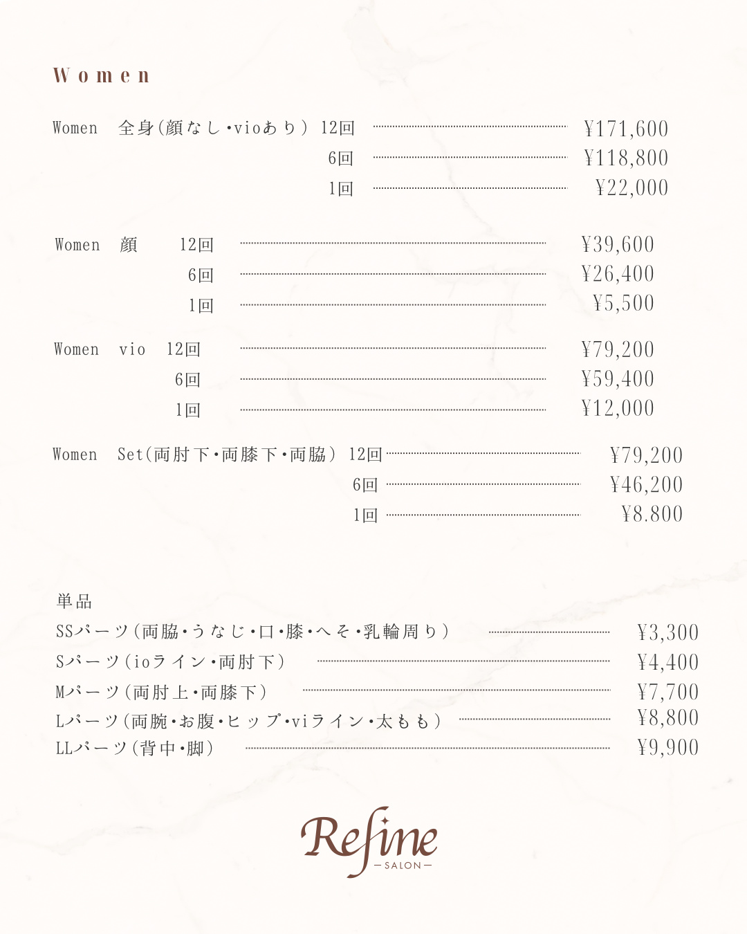 各メニューのボタンをタップすると料金が確認できます。